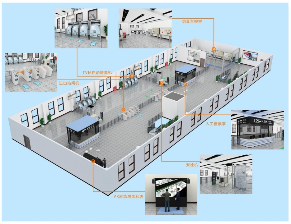 系統(tǒng)根據(jù)城軌車站實際功能與業(yè)務拓撲結構構建了基于車站ATS、C-LOW、CCTV和ISCS等應用軟件與IBP盤、AFC、FAS、PA、PSD、軌旁信號等實訓設備為基礎的場景與數(shù)學模型,是結合城軌實際運營場景和相關設備真實邏輯控制關系組建的集行車組織、供電控制、信號控制等于一體的仿真培訓系統(tǒng)。系統(tǒng)可實現(xiàn)與車站級ATS、ISCS、CCTV等仿真實訓系統(tǒng)的聯(lián)動聯(lián)控。系統(tǒng)采用分布式協(xié)同仿真及虛擬現(xiàn)實仿真技術,實現(xiàn)了標準化作業(yè)培訓與考核、應急預案場景演練與比選、事故原因分析等功能。演練科目包括相鄰車站接發(fā)列車作業(yè)、車站值班員與站臺站廳站務員協(xié)同工作、車站值班員與維保人員協(xié)作演練以及大客流、惡天氣、車站火災、設備故障、列車區(qū)間停車等。